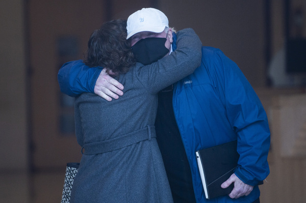 Michael Skakel hugs his defense attorney Jessica Santos after arriving to Stamford Superior Court Friday, Oct. 30, 2020, in Stamford, Connecticut.. Skakel is back in court, 45 years to the day after the murder of his teenaged neighbor in Greenwich, Martha Moxley. (Kassi Jackson/Hartford Courant/TNS)