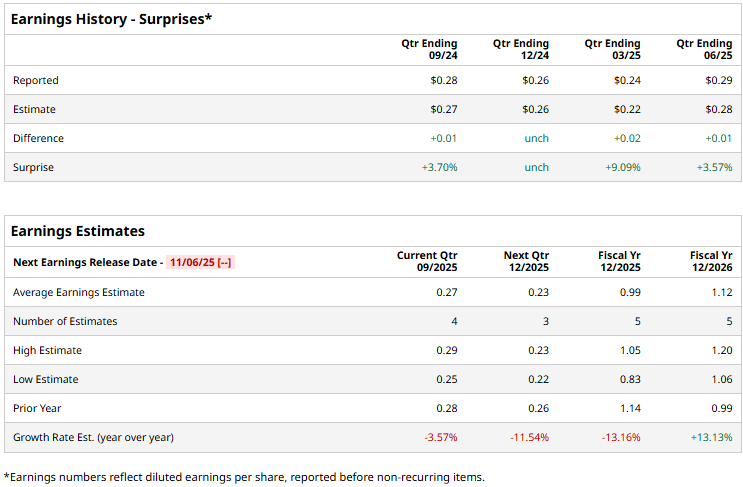 The household and personal products giant is expected to announce its third-quarter results by early November. Ahead of the event, analysts expect KVUE to report an adjusted EPS of $0.27, down 3.6% from $0.28 reported in the year-ago quarter. On a positive note, the company has a robust earnings surprise history. It has met or surpassed the Street’s bottom-line estimates in each of the past four quarters.
