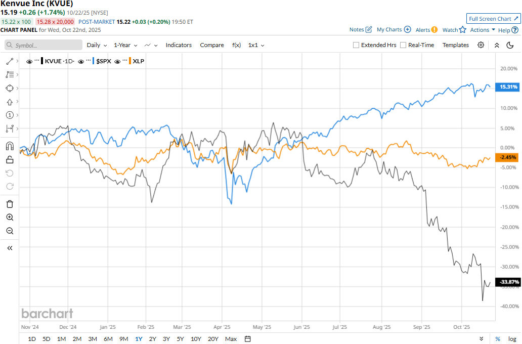KVUE stock prices have plummeted 33.8% over the past 52 weeks, notably underperforming the Consumer Staples Select Sector SPDR Fund’s (XLP) 2.8% dip and the S&P 500 Index’s ($SPX) 14.5% gains during the same time frame.