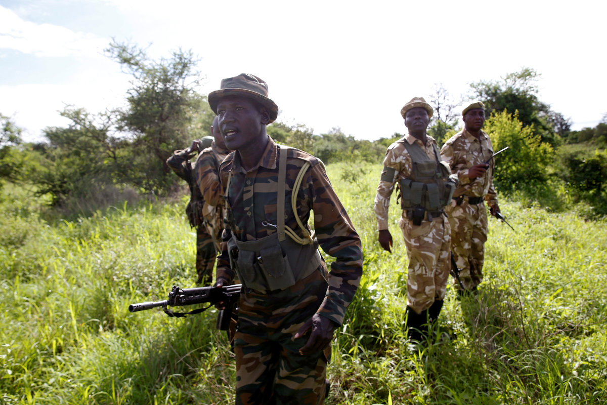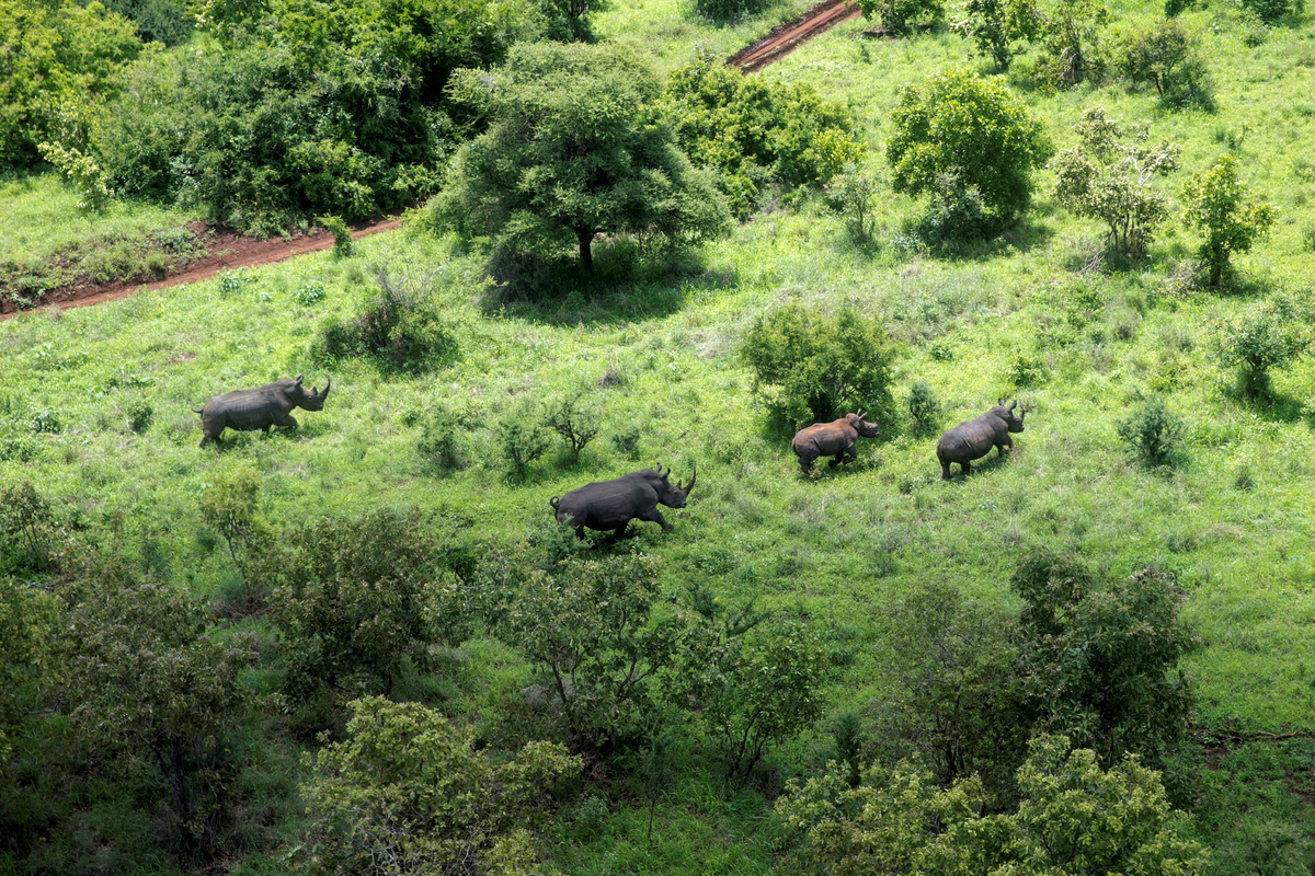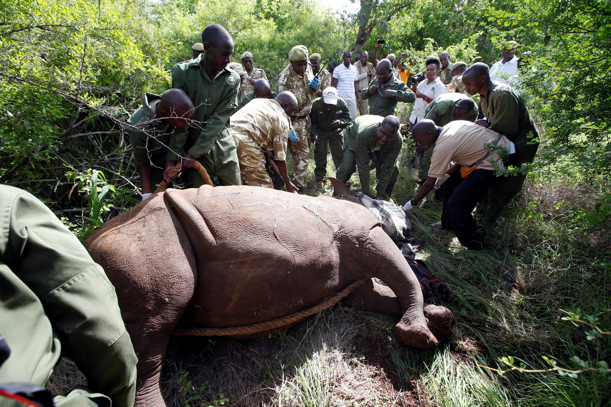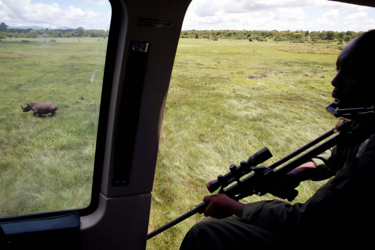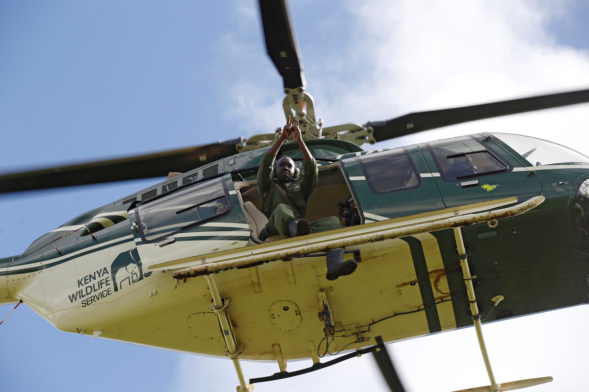Rhinos are tracked from a Kenya Wildlife Service (KWS) helicopter during the launch of a rhino ear notching exercise and the inauguration of the extended Rhino Sanctuary at Meru National Park, Kenya, April 5, 2018. REUTERS/Baz RatnerA wildlife ranger signals from a Kenya Wildlife Service (KWS) helicopter at the location of a tranquillised rhino during the launch of a rhino ear notching exercise and the inauguration of the extended Rhino Sanctuary at Meru National Park, Kenya, April 5, 2018. REUTERS/Baz RatnerA wildlife ranger signals from a Kenya Wildlife Service (KWS) helicopter at the location of a tranquillised rhino during the launch of a rhino ear notching exercise and the inauguration of the extended Rhino Sanctuary at Meru National Park, Kenya, April 5, 2018. REUTERS/Baz RatnerA tranquillised rhino is tracked from a Kenya Wildlife Service (KWS) helicopter during the launch of a rhino ear notching exercise and the inauguration of the extended Rhino Sanctuary at Meru National Park, Kenya, April 5, 2018. REUTERS/Baz RatnerA Kenya Wildlife Service (KWS) veterinarian cuts a notch in ear of a tranquillised rhino during the launch of a rhino ear notching exercise and the inauguration of the extended Rhino Sanctuary at Meru National Park, Kenya, April 5, 2018. REUTERS/Baz RatnerWildlife rangers stand guard during the launch of a rhino ear notching exercise and the inauguration of the extended Rhino Sanctuary at Meru National Park, Kenya, April 5, 2018. REUTERS/Baz Ratner