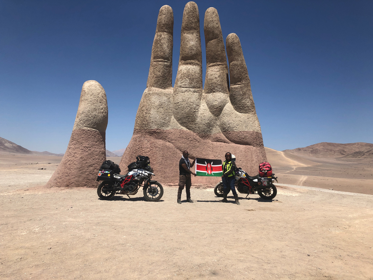 FILE PHOTO: Kenyan biker couple Dos Kariuki and Joanne Wamuyu hold the Kenyan flag as they attempt to travel the world on motorbikes at the Mano del Desierto (Hand of the Desert) sculpture in the Atacama Desert in Chile, on March 4, 2019. Wamuyu and DoS of Throttle Adventures/Handout via REUTERS