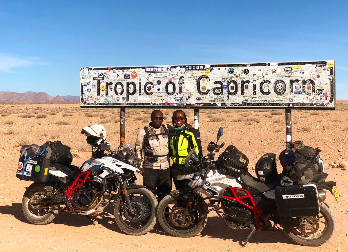 FILE PHOTO: Kenyan biker couple Dos Kariuki and Joanne Wamuyu pose for a photograph as they attempt to travel the world on motorbikes at the Tropic of Capricorn sign between Sossusvlei and Walvis Bay in Namibia, on September 2, 2018. Wamuyu and DoS of Throttle Adventures/Handout via REUTERS