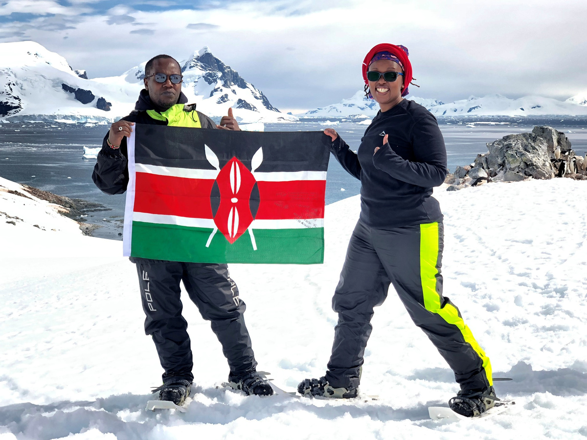 FILE PHOTO: Kenyan biker couple Dos Kariuki and Joanne Wamuyu hold the Kenyan flag as they attempt to travel the world on motorbikes in Antarctica, January 1, 2019. Wamuyu and DoS of Throttle Adventures/Handout via REUTERS