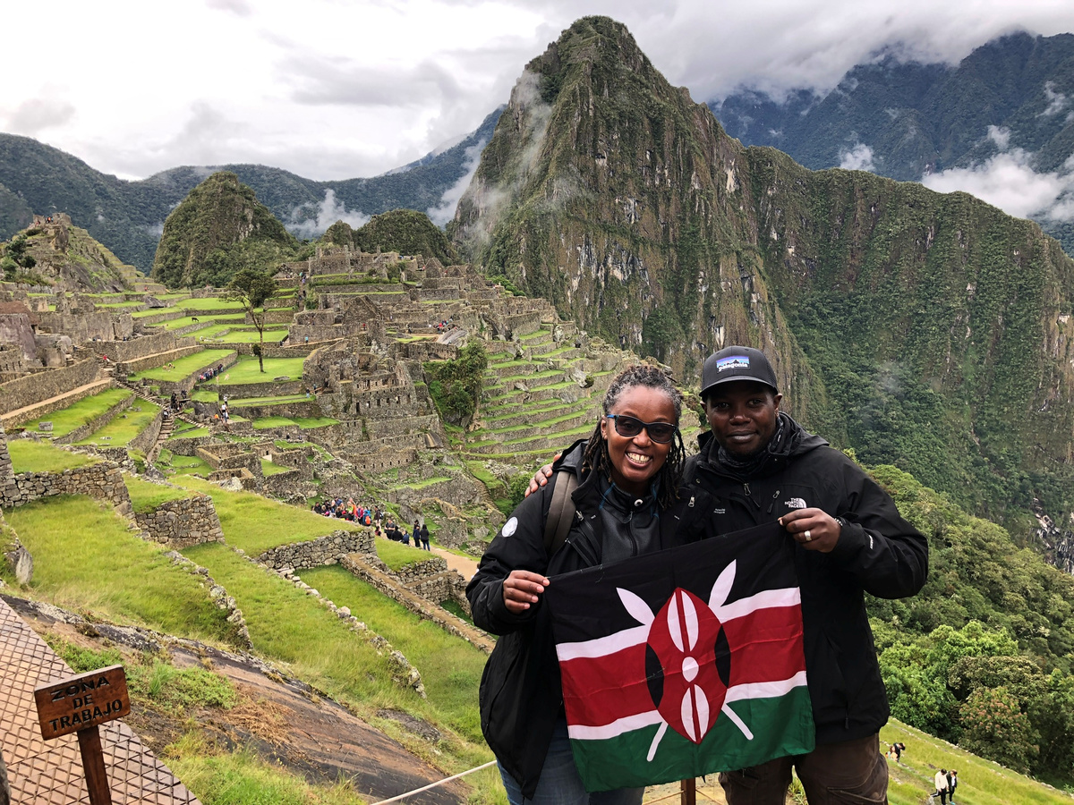 Kenyan biker couple Dos Kariuki and Joanne Wamuyu hold the Kenyan flag as they attempt to travel the world on motorbikes in Machu Picchu, Peru April 16, 2019. Picture taken April 16, 2019. Wamuyu and DoS of Throttle Adventures/Handout via REUTERS