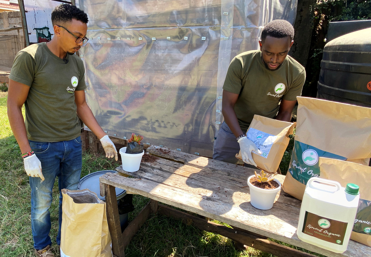 The locally-owned company, Sprout Organic, mixes animal bone meal, seeds, foliage, dry leaves, twigs and kitchen waste like banana peels, to concoct a composite that is then sold to urban farmers like Wachira to grow food in small spaces.