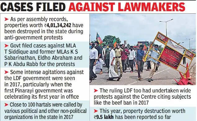 According to the assembly records, properties worth Rs 4,01,34,242 have been destroyed in the state in connection with various anti-government protests in the state. The government has also registered cases against present MLA T Siddique and former MLAs K S Sabarinathan, Eldho Abraham and P K Abdu Rabb in connection with these protests. As per the evaluation of the destruction, more than half of the destruction happened in 2017, when Rs 2.04 crore worth of public properties were destroyed.