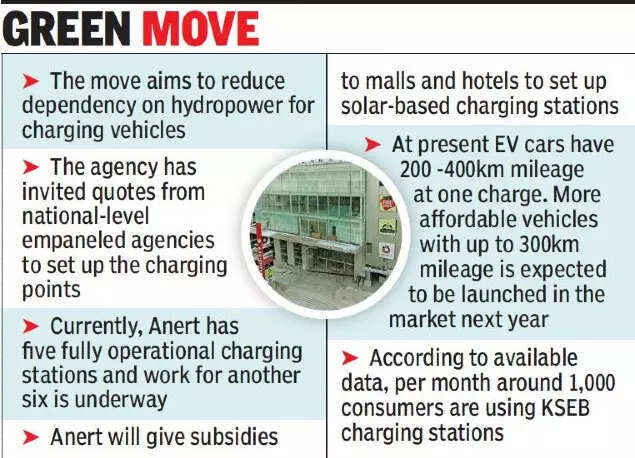 KOCHI: Aiming to tap non-conventional energy to run electric vehicles, Agency for Non-Conventional Energy and Rural Technology (Anert) is going to install solar-based electric vehicle charging stations at hotel and mall premises in the state. The move will thereby reduce the dependency on hydropower for charging vehicles.