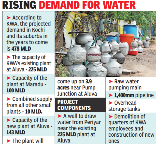 The project will comprise construction of a well to draw water from Periyar near the existing 225 MLD plant of KWA at Aluva, raw water pumping main, 1,400mm pipeline, overhead storage tanks and demolition and construction of quarters for KWA employees. The KWA has already started dismantling of the quarters on the project site near Pump Junction at Aluva and construction of quarters in lieu of the ones which are being demolished. The new quarters are being constructed in a holding near Aluva Town Hall. Once the demolition and other preparatory works are completed, the work on the proposed 143 MLD water treatment plant can be started on the 3.9 acres near Pump House Junction.