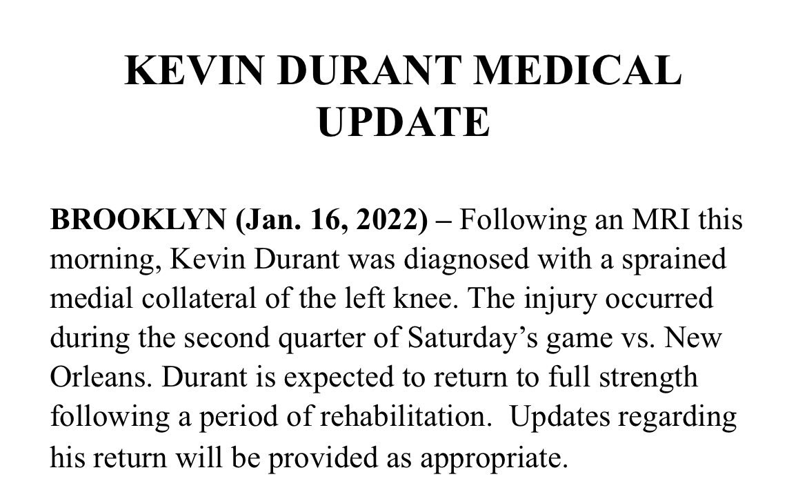 Shams Charania: Nets‘ Kevin Durant has been diagnosed with a sprained medial collateral of the left knee and will return to full strength after period of rehab, team says. -via Twitter @ShamsCharania / January 16, 2022