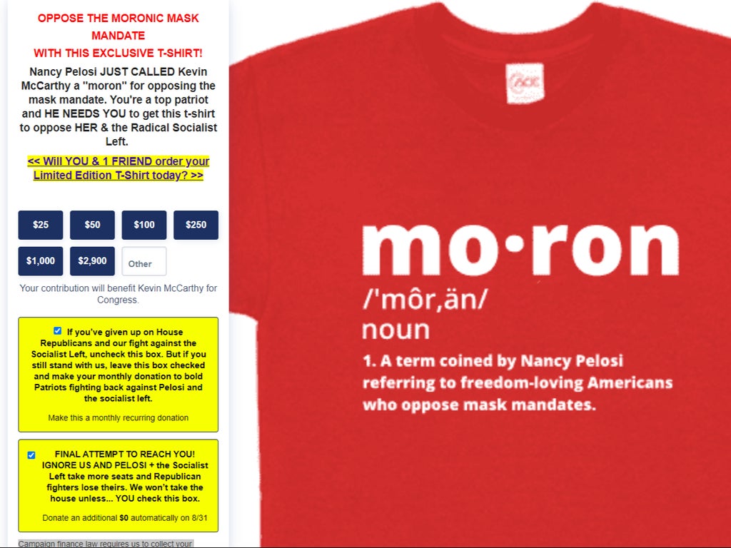 The shirt was created in response to a derogatory remark from Nancy Pelosi. Asked by a reporter what she thought of Mr McCarthy’s claim that the House of Representatives’ mask mandate was unscientific, she replied: “Such a moron.”
