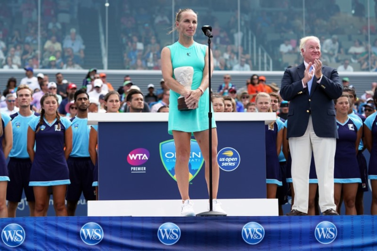 Aug 18, 2019; Mason, OH, USA; Svetlana Kuznetsova (RUS) stands on stage with the runner up trophy after being defeated by Madison Keys (USA) during the finals of the Western and Southern Open tennis tournament at Lindner Family Tennis Center. Mandatory Credit: Aaron Doster-USA TODAY Sports