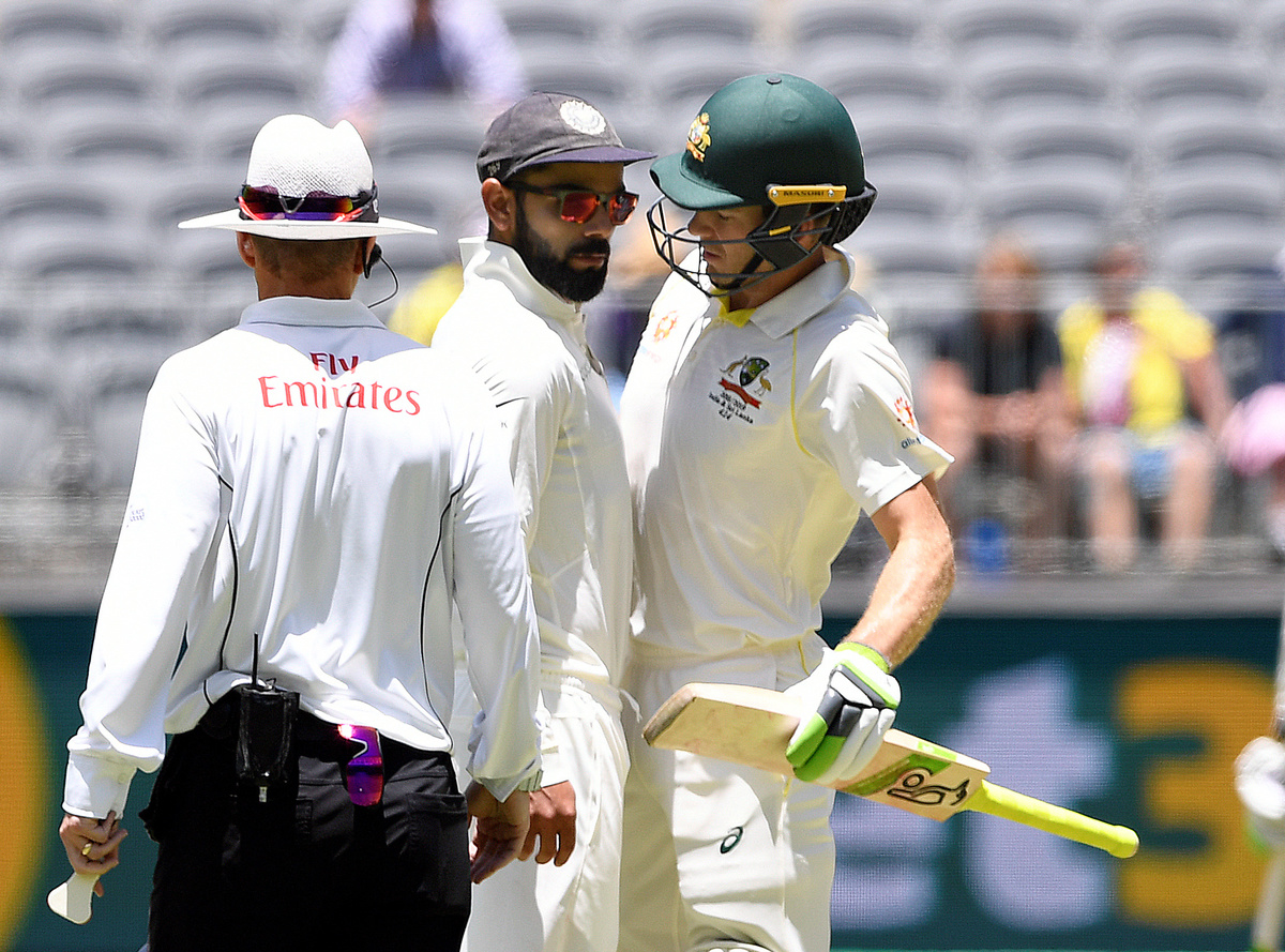 Shortly before lunch, Paine and his Indian counterpart Virat Kohli were involved in a heated exchange which forced umpire Chris Gaffaney to step in.