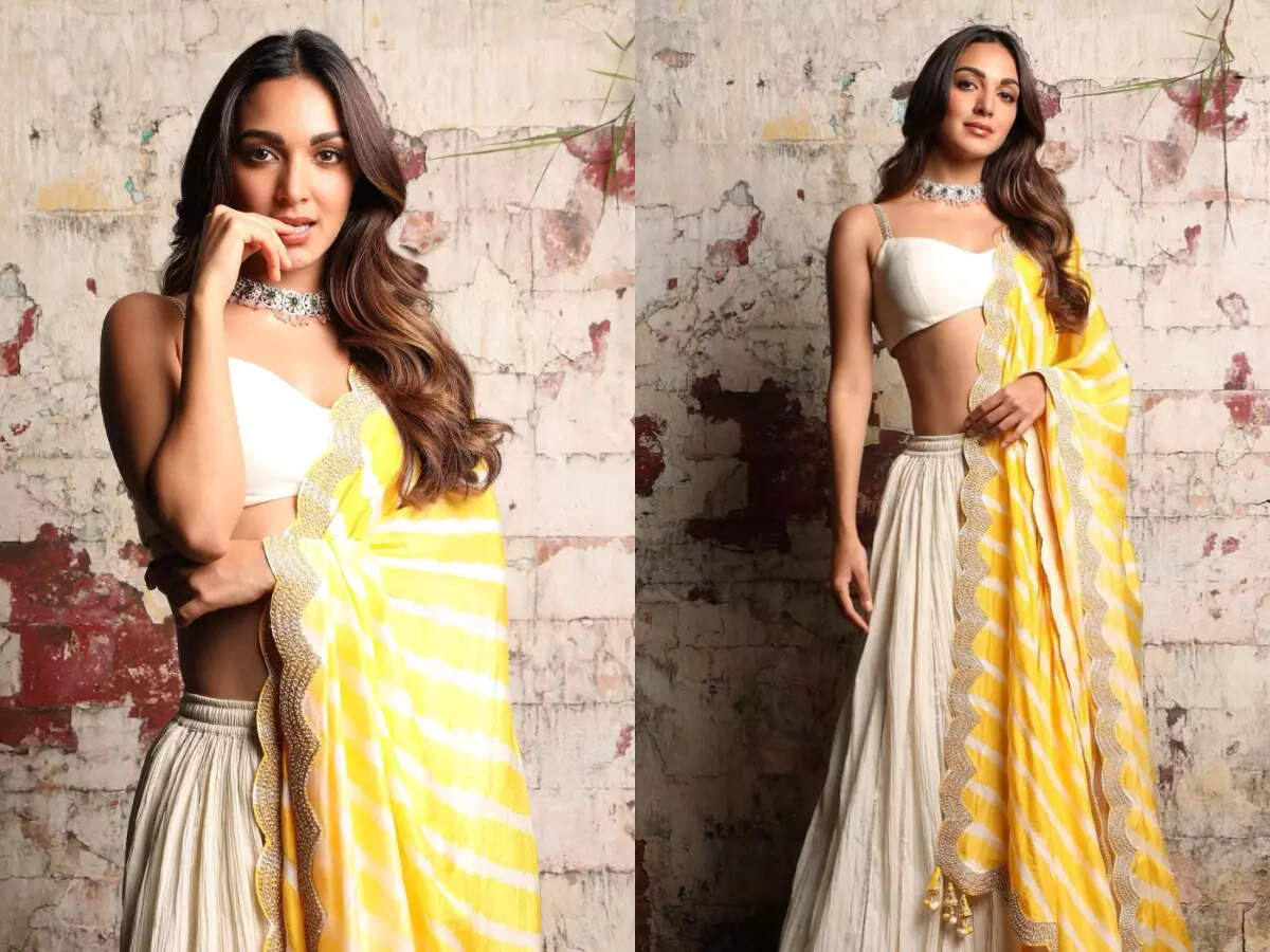 The actress, who's going out and about to promote her movie stunned in a modern lehenga set from Fabiiana. Kiara picked up an off white bralette and matching lehenga skirt. She teamed it up with a leheria dupatta in yellow. You can pick a similar lehenga for your friend's mehendi ceremony and all would-be-bride's can pick a similar outfit for their haldi ceremony.
