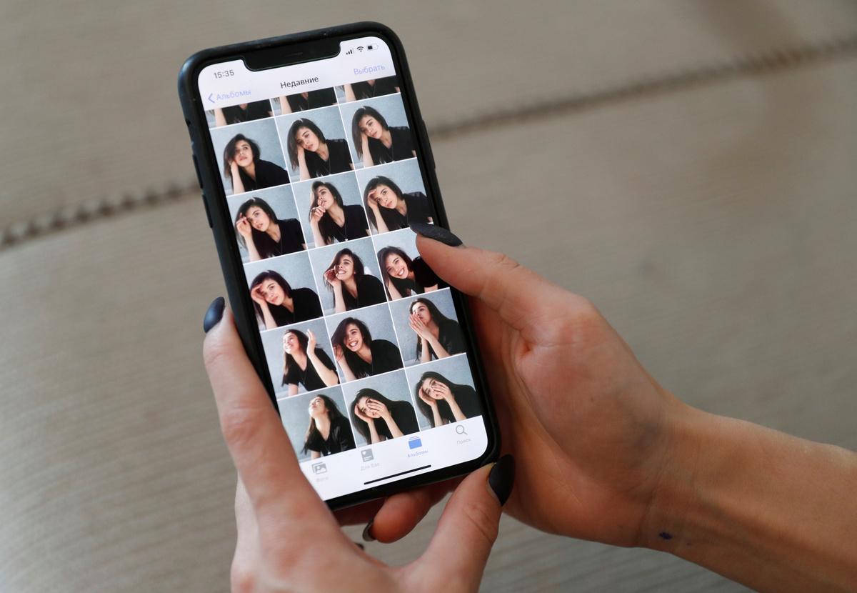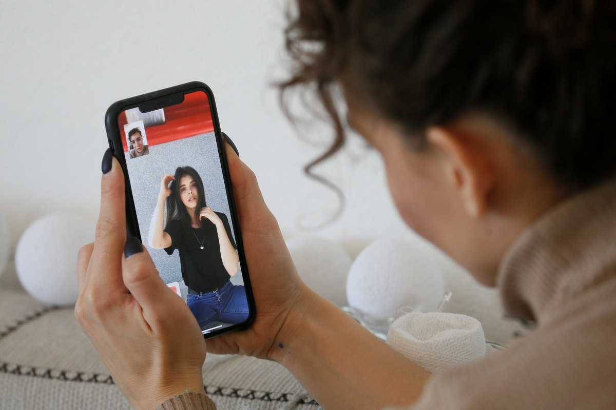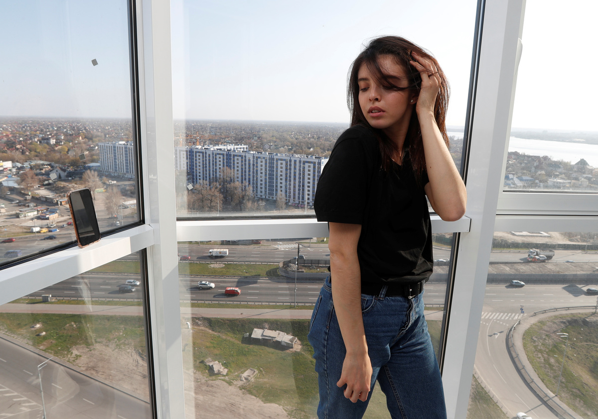 A dancer Alina Kobyliak poses for Ukrainian photographer Kate Kondratieva who uses her smartphone to take pictures as screenshots via video call, during a partial lockdown imposed by authorities to slow the spread of the coronavirus disease (COVID-19), in Kiev, Ukraine April 7, 2020. REUTERS/Valentyn Ogirenko