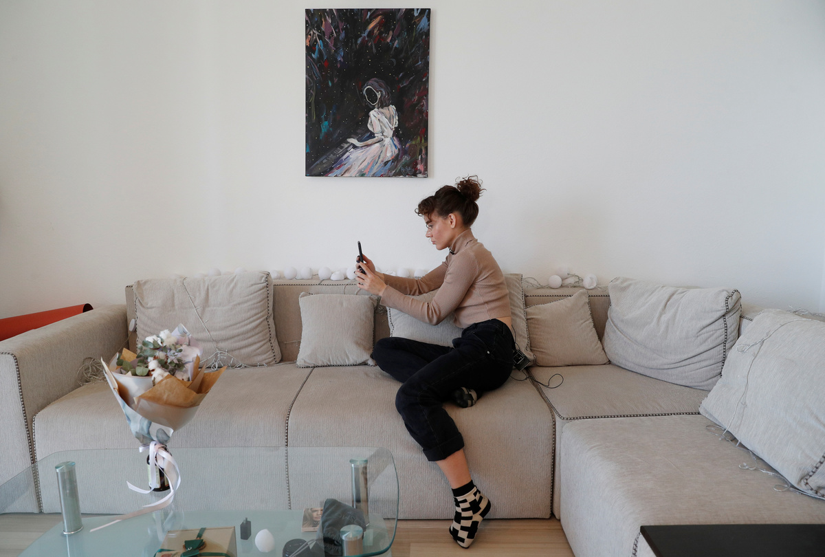 Ukrainian photographer Kate Kondratieva uses her smartphone to take pictures of a dancer Alina Kobyliak as screenshots via video call in the kitchen of her apartment, during a partial lockdown imposed by authorities to slow the spread of the coronavirus disease (COVID-19), in Kiev, Ukraine April 7, 2020. REUTERS/Valentyn Ogirenko