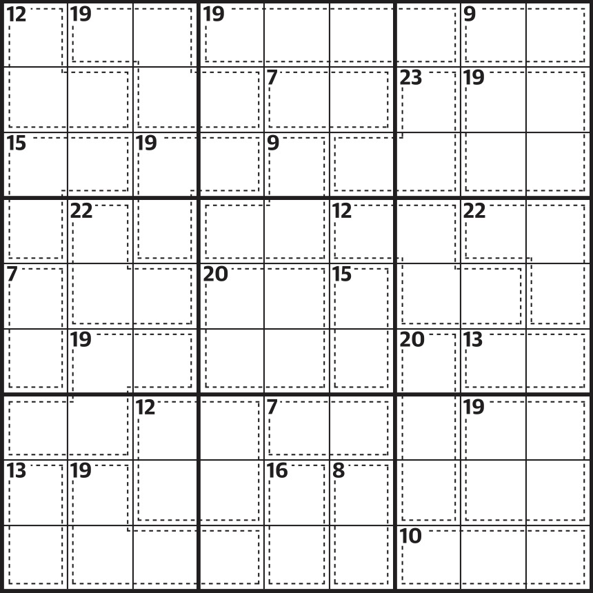 Normal sudoku rules apply, except the numbers in the cells contained within dotted lines add up to the figures in the corner. No number can be repeated within each shape formed by dotted lines.
