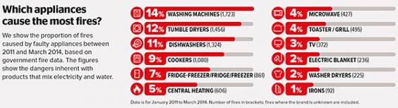 Research by Which?, the consumer site, showed that washing machines accounted for the greatest number of appliance fires in the home between 2011 and 2014.