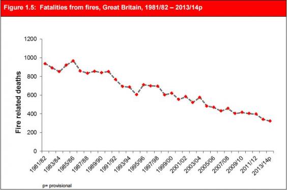 The number of deaths from fires has also fallen dramatically over the last thirty years.