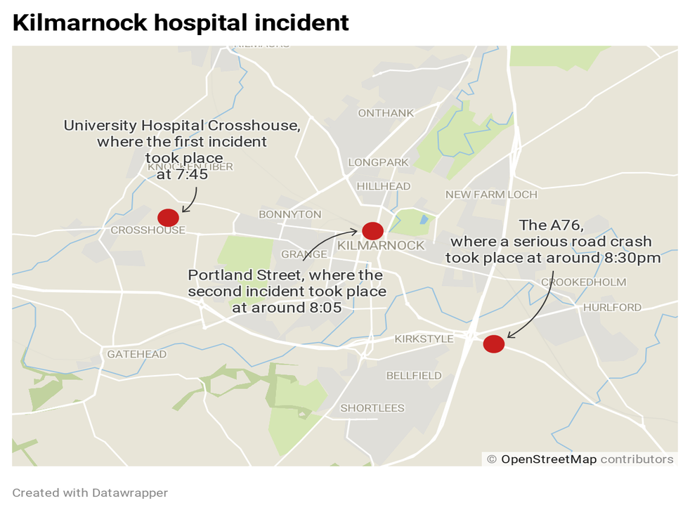 "Police Scotland is currently dealing with 3 potentially linked incidents in the Kilmarnock area", the force said on Twitter. "The first occurred around 7.45pm outside Crosshouse Hospital, the second around 20 minutes later on Portland Street, and the third, a serious road crash, on the A76, around 8.30pm."