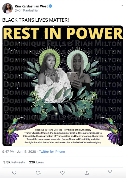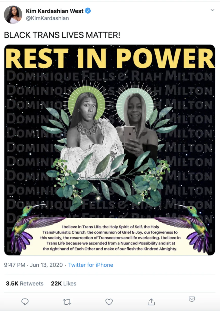 Kim tweeted, “BLACK TRANS LIVES MATTER!” to her 65.5 million followers, along with the image, which read “REST IN POWER” atop a grayscale photo of Fells alongside that of Shanna. Fells’s and Milton’s names are repeated in the background of the graphic, and prayerful text approximating the Catholic Profession of Faith is inscribed on the bottom.