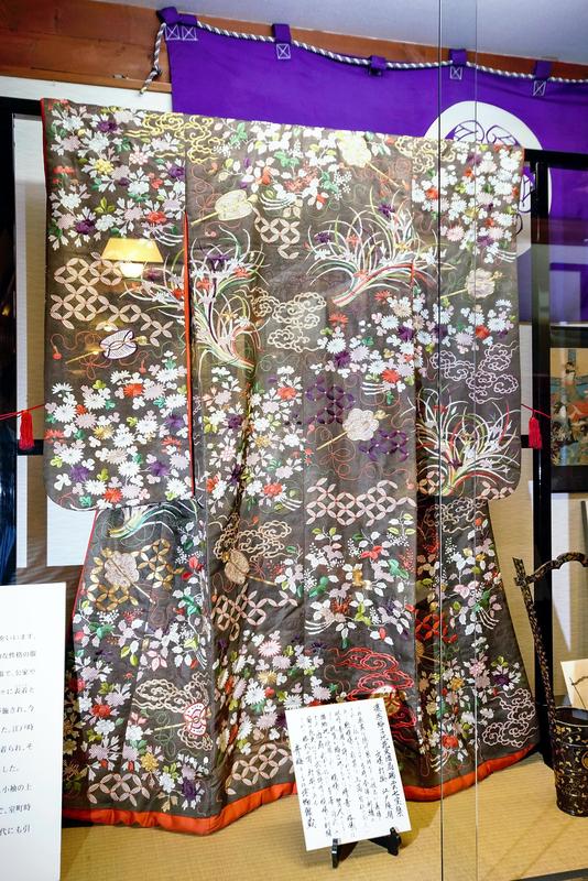 A 160-year-old building currently displays the clothing that Prince Nashimoto-no-Miya Morimasa and Princess Itsuko wore during Emperor Taisho's enthronement. The outfit that Princess Itsuko wore, known as "itsutsuginu kouchigi," weighs about 13 kilograms.