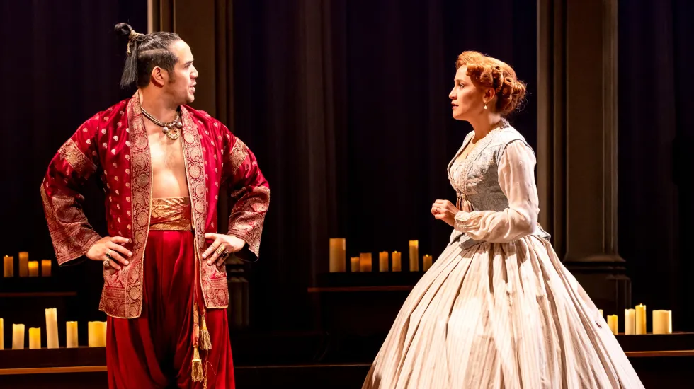 Anna is soon beloved by the children and exasperated by the King, particularly his tyrannical insistence on slavish, unthinking devotion. As they so often do in musicals, opposites attract, and the sexual tension and mutual admiration that grows between Anna and the King is palpable in Betsy Morgan and Adam Jacobs’ feisty, fraught banter and well-matched, soaring vocals.
