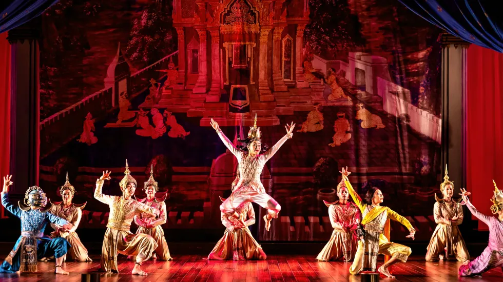 Drury Lane’s ensemble and its design team show significant progress in both inclusive casting and amplifying the culture of story’s setting. Darren Leet’s choreography uses dance vocabulary rooted in Southeast Asia. Wilson Chin and Riw Rakkulchon’s set design is defined by the distinctive architecture of stupas, the gracefully triangular Buddhist shrines.