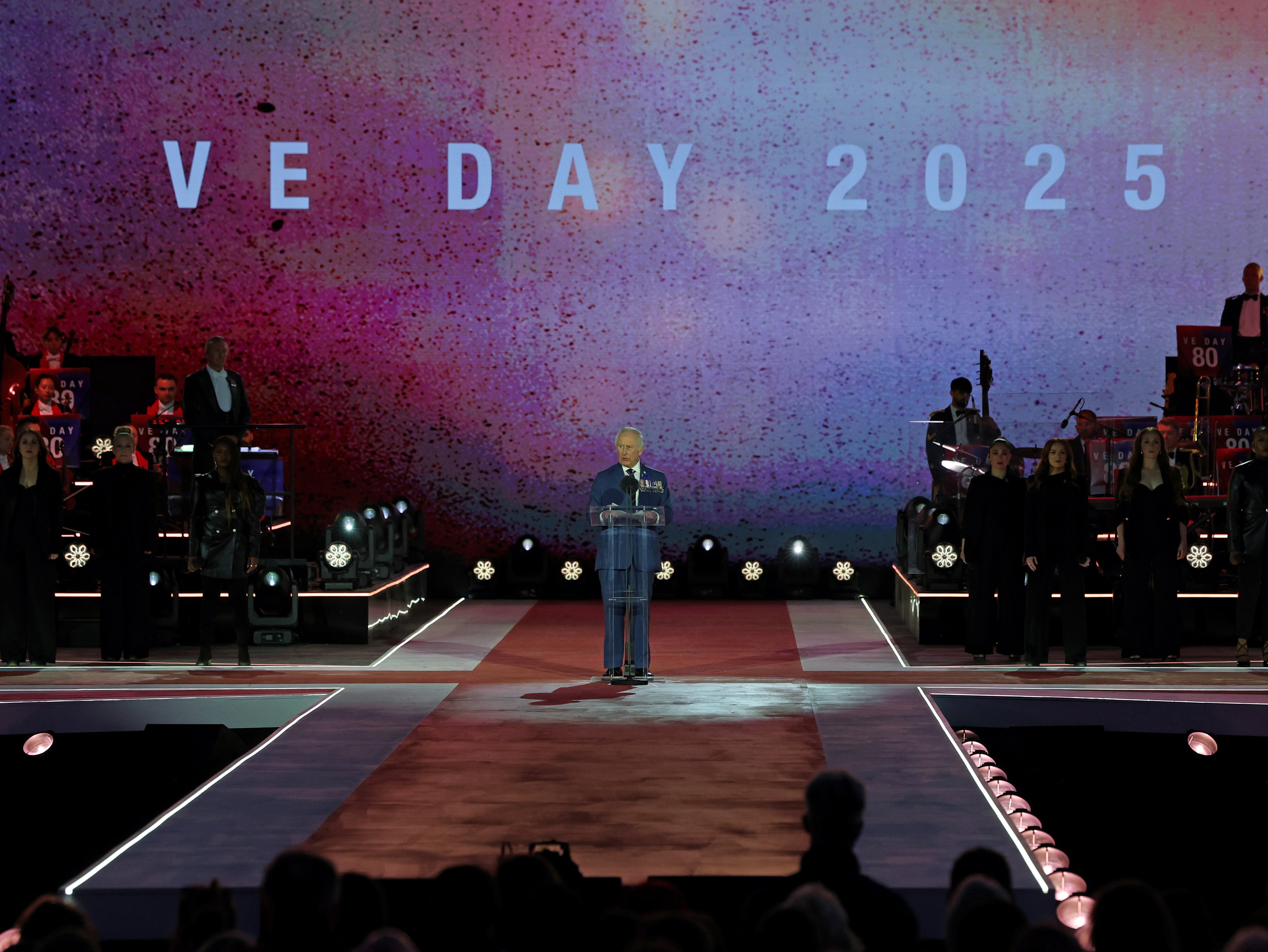 He took to the Union flag-coloured stage during a celebratory concert – the finale of four days of VE Day commemorations – at London’s Horse Guards Parade on Thursday evening.
