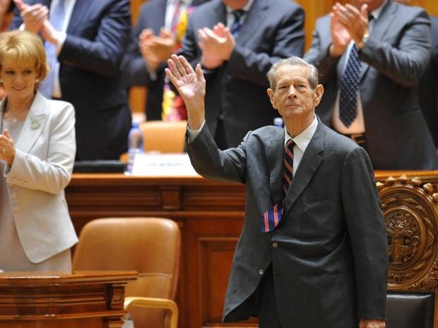 A second visit to Romania in 1994 also had to be aborted. As these showdowns demonstrated, Michael was no match for Romania’s new President, Ion Iliescu, a former communist apparatchik who was determined to neutralise the former king. In 2003, Iliescu – serving his final term – struck a deal with Michael, allowing him to return to Bucharest provided he did not campaign for the return of the monarchy. Michael served as a goodwill ambassador for Romania, and successfully lobbying to receive £21m in compensation from the government for royal property confiscated by the communist regime.