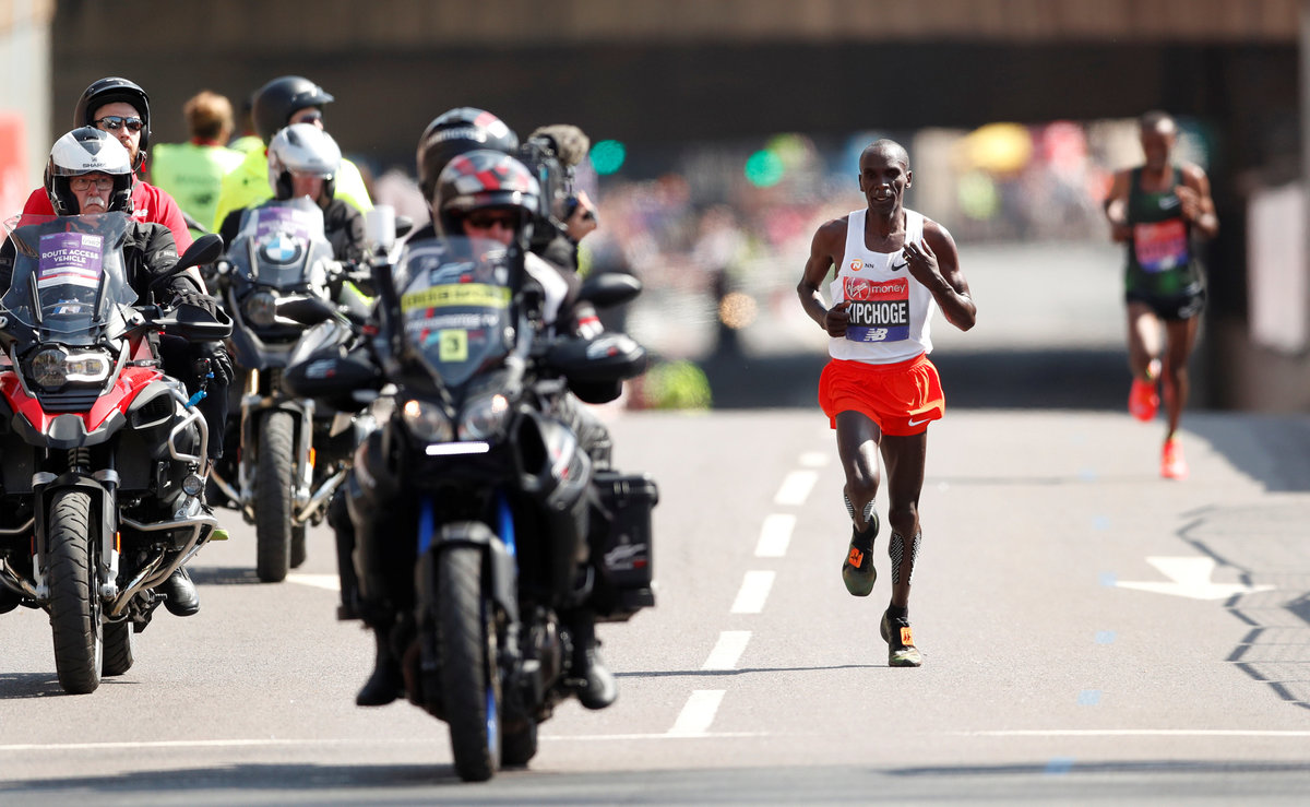 Having taken a break from the London Marathon last year to try to run a sub-two-hour marathon in Italy, Kipchoge returned to add to his 2015 and 2016 titles with ease, finishing ahead of Ethiopia’s Tola Shura Kitata in 2:04:17, two minutes 20 seconds off Dennis Kimmetto’s world record.