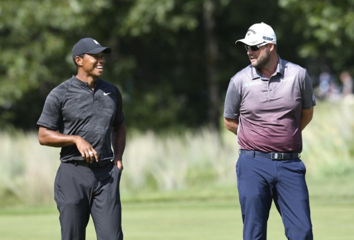 Americans Chris Kirk, Beau Hossler, Keegan Bradley and Gary Woodland were a stroke back while Tiger Woods endured an up-and-down round of 72 to sit seven shots off the lead.