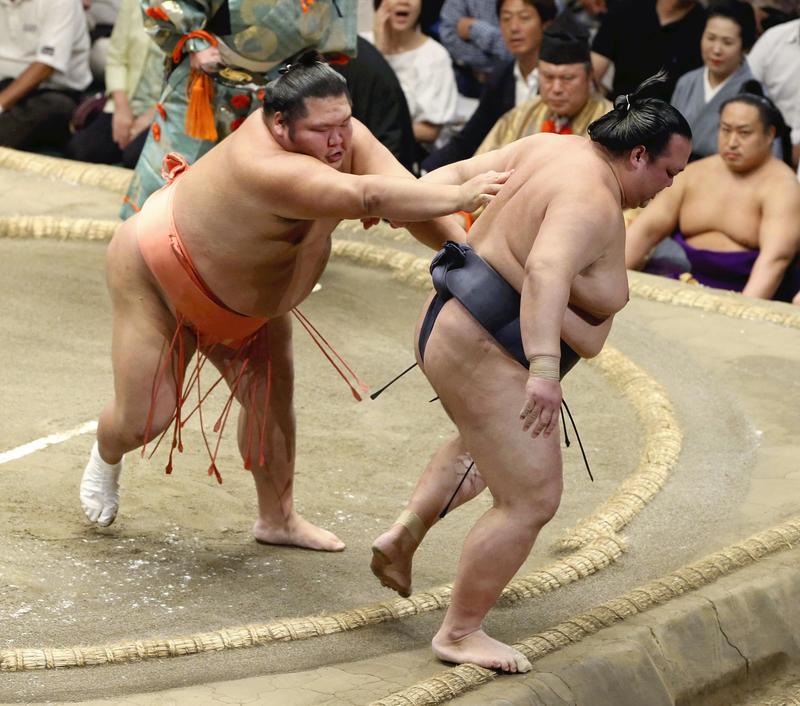 After a firm jump-off, the yokozuna struggled to secure a grip of the nimble maegashira, who dodged Kisenosato's charge with a deft side-step before guiding him out of the ring.