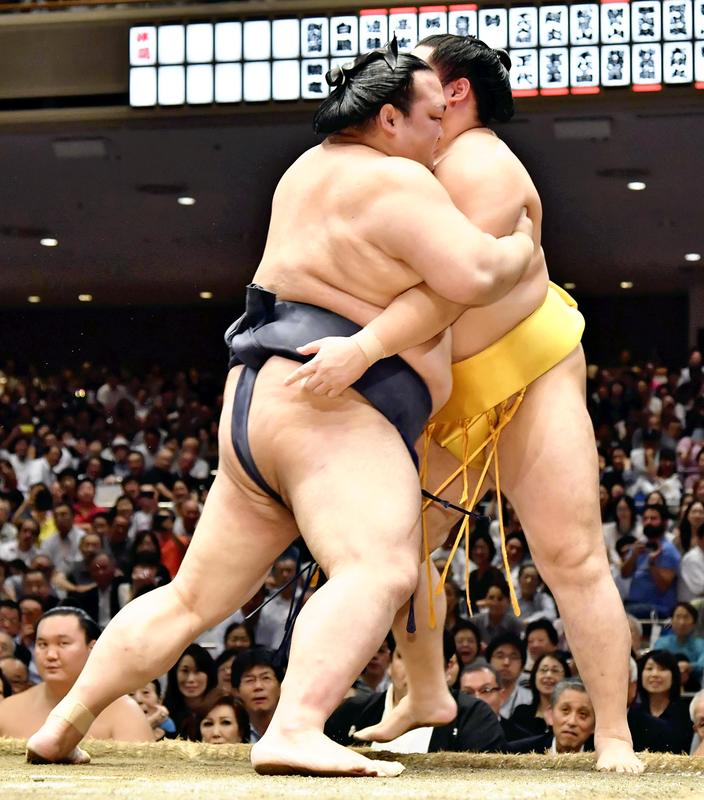 The yokozuna duo of Hakuho and Kakuryu both remained unbeaten. Hakuho powerfully forced out massive sekiwake Ichinojo, while Kakuryu -- once forced to the edge of the ring -- came back to beat sekiwake Mitakeumi (6-4).