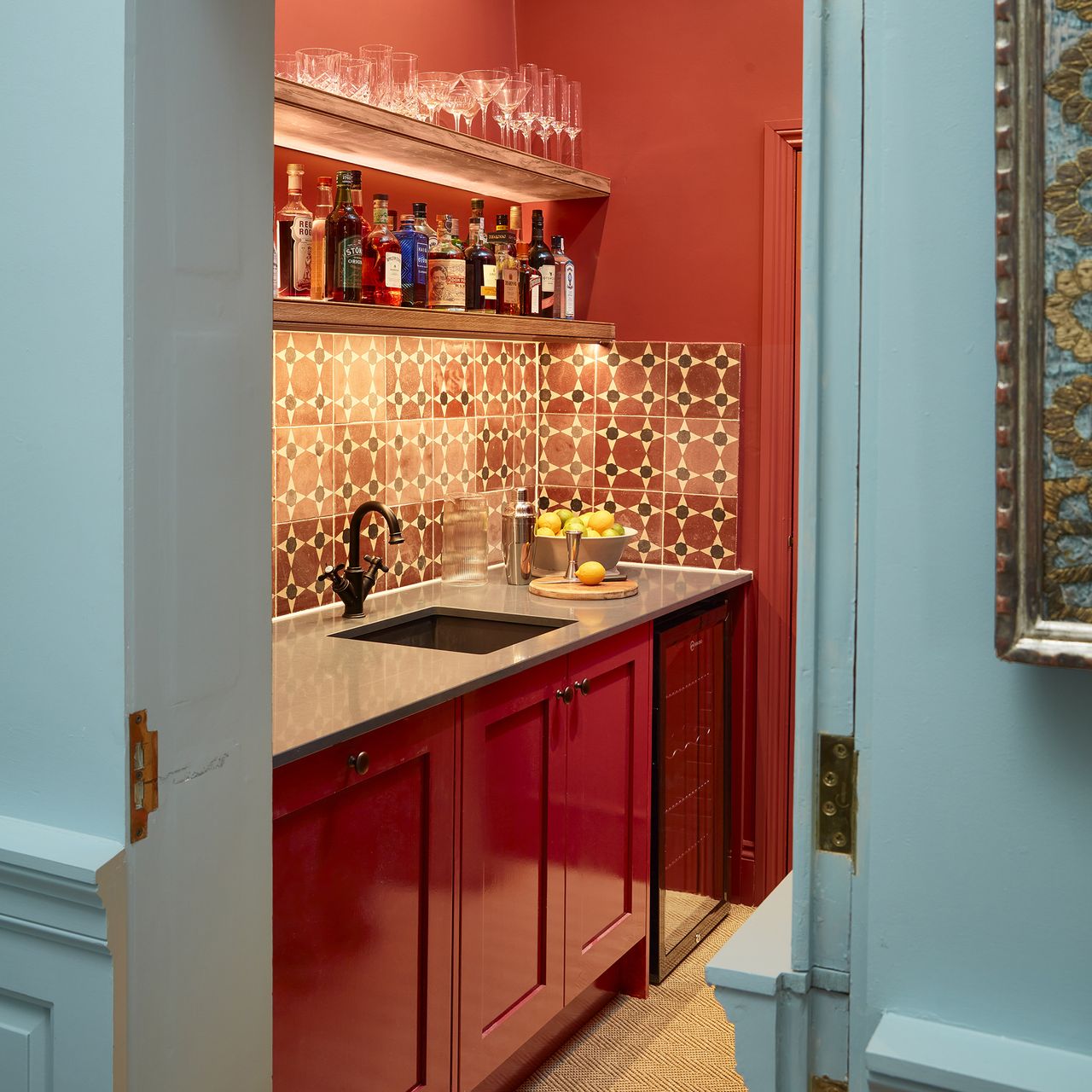 Colour can, and should be used bravely in a bantry. Separating the space with glass-fronted doors will allow a hint of playful colour to peep through, creating the fun atmosphere associated with a bar area.