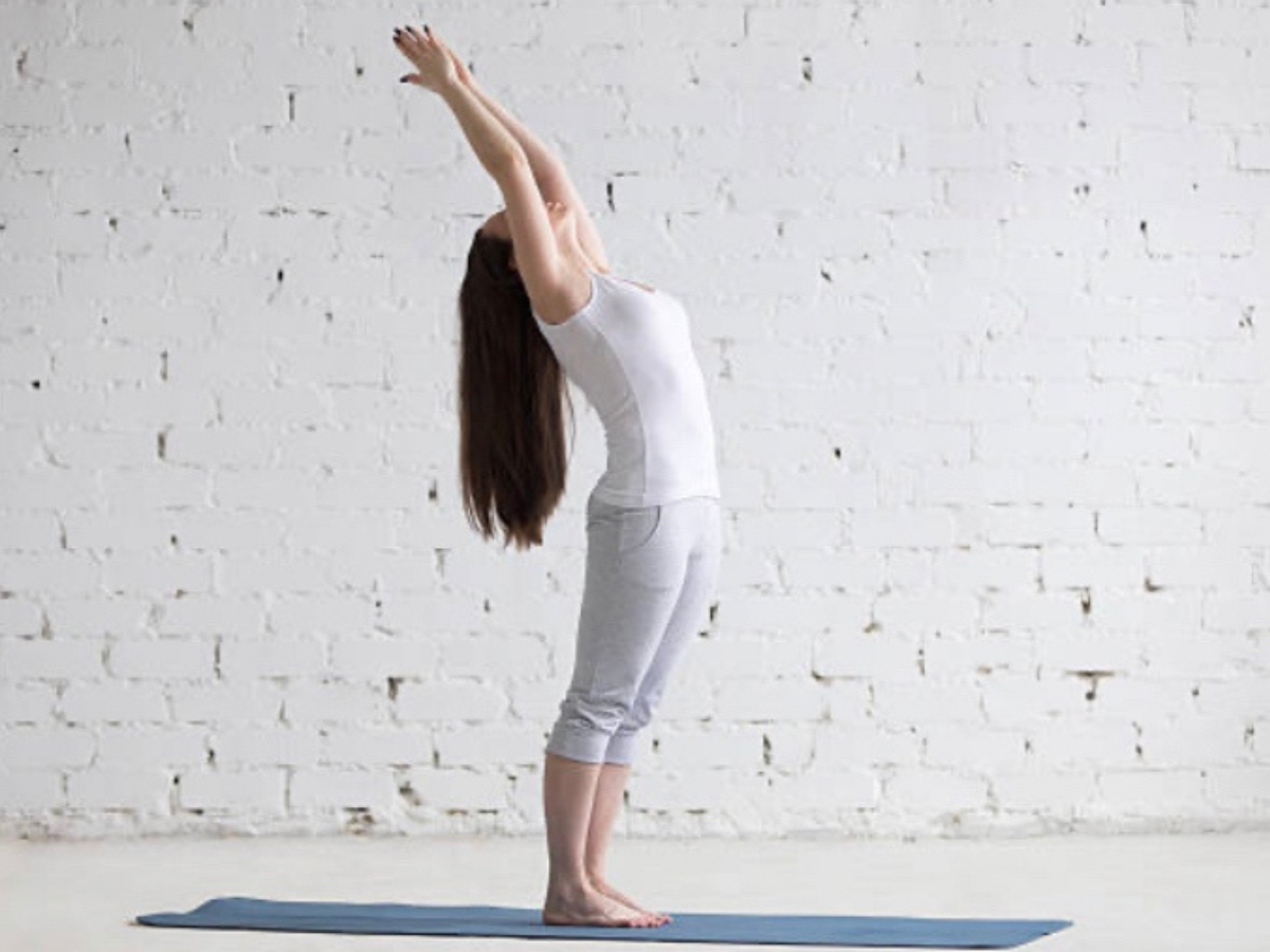 Stand one foot away from a wall or almirah in your kitchen.Bring your hands back from over your head on the wall, opening both shoulders.Keeping your body, spin, sternum and ribcage straight bend towards the back.Gently come up and release the posture.This gentle backbend posture is the best way to say a ‘hi’ to your spine through its intense sensation.