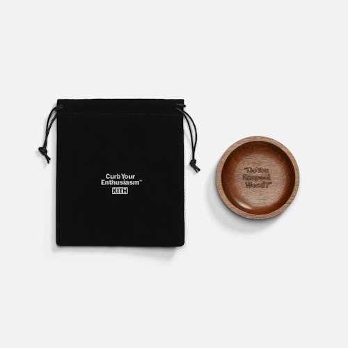 Homeware like mugs, wooden coasters, and a poster are also included in the capsule, with all pieces flaunting both Kith and Curb Your Enthusiasm co-branding. The white, navy, and black mugs repeat David’s famous catchphrase — ”pretty good; pretty, pretty… pretty good” — while the wooden coasters read, “do you respect wood?” to nod to an episode where Larry is blamed for leaving a ring stain on Julia Louis-Dreyfus' table.