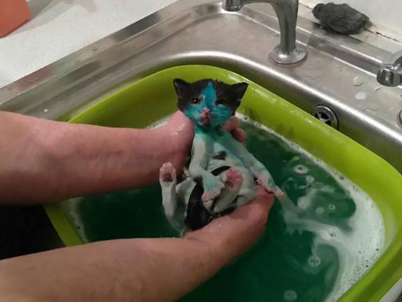 Photos showed the water turning bright blue as the kittens were given a bath, and the dye remained in their fur a day after the ordeal.
