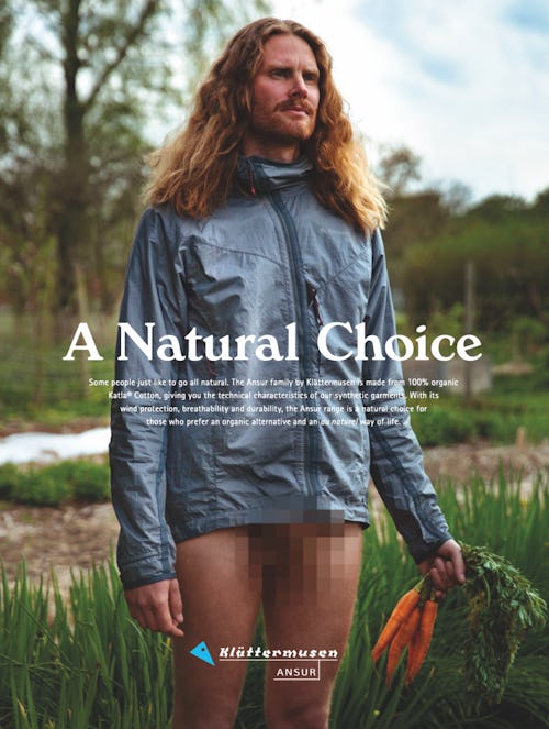 Klättermusen is adamant about driving its message home. The campaign visuals feature a hiker holding a bushel of carrots and wearing (only) the Ansur Wind Jacket, noting that the collection “is a natural choice for those who prefer an organic alternative and an au natural way of life.” In the campaign video, the actors make clear that Ansur is their only choice for clothing as a way to connect with nature.