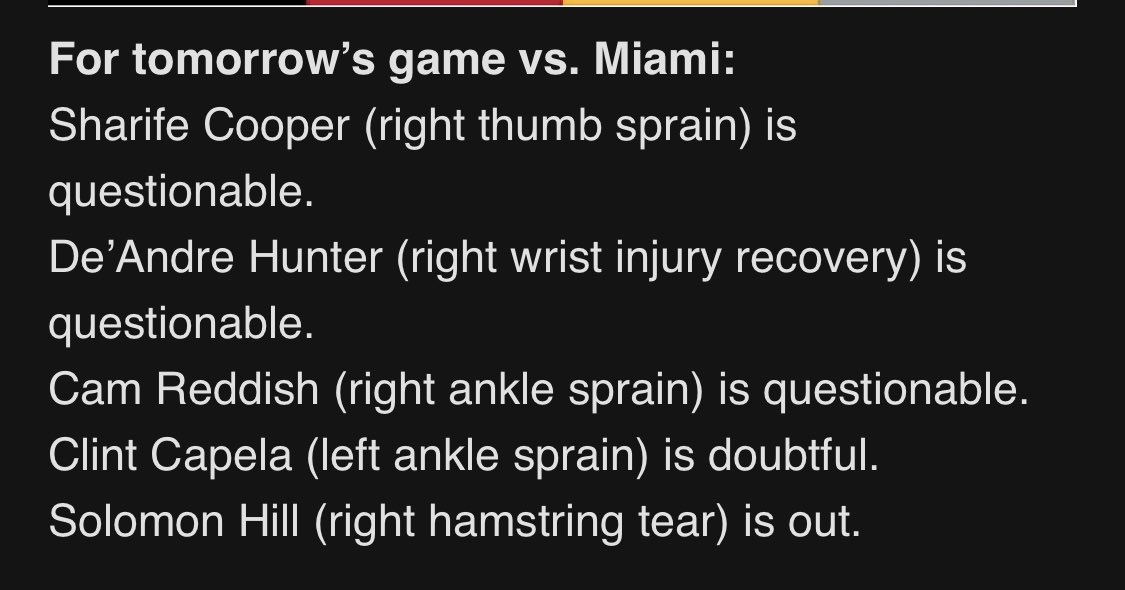 De’Andre Hunter and Cam Reddish are questionable for tomorrow.