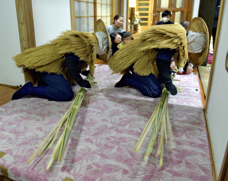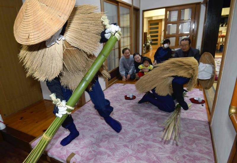 Two men dressed as kasedori, or bird messengers of god, perform a ritual to ward off misfortune by banging bamboo poles on the floor of someone's house on Saturday night during the Mishima no Kasedori festival, which has been held for about 380 years in Saga's Mishima district. The festival is part of the ritual visits of deities in masks and costumes known as Raiho-shin, which was added to UNESCO's Representative List of the Intangible Cultural Heritage of Humanity in 2018.