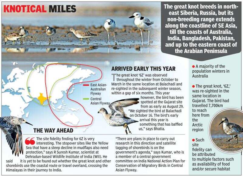 AHMEDABAD: Gujarat’s birdwatchers had reason to cheer when for the third year in a row, a great knot (Calidris tenuirostris), a shorebird tagged in Russia and code-named ‘6Z’, returned to the coastal village of Balachadi in Jamnagar district.
