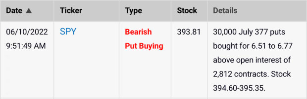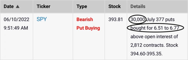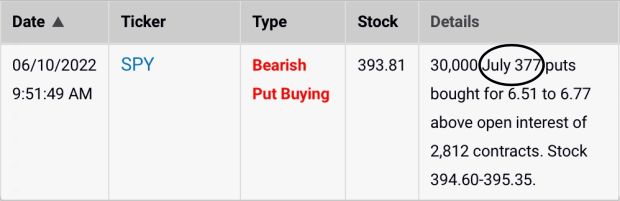 This option purchase expires in July, and the strike is $377. That means this trader is predicting that (SPY) will descend below $377 by July.