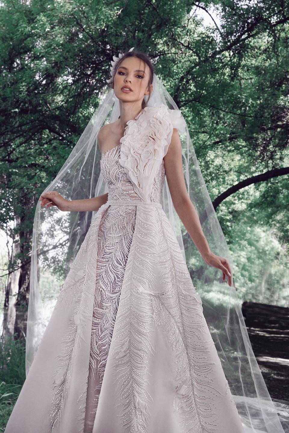 “She might fall for princess gowns or versatile overskirts, or she might prefer a clinched waist or a body-hugging line, or a heart-shaped bustier or long, illusion sleeves- laces, organza, tulle, off-white or blush,” notes the House in a statement. But, whatever a bride is desiring, Ward has provided her the gift of choice, from column overskirt gowns, and off the shoulder volume in “Aisha;” to a pale rose gold sequined gown with a lace cape in “Vanina;” and, “Kendall” with its off-the shoulder A-line gown with long flowing trumpet sleeves.
