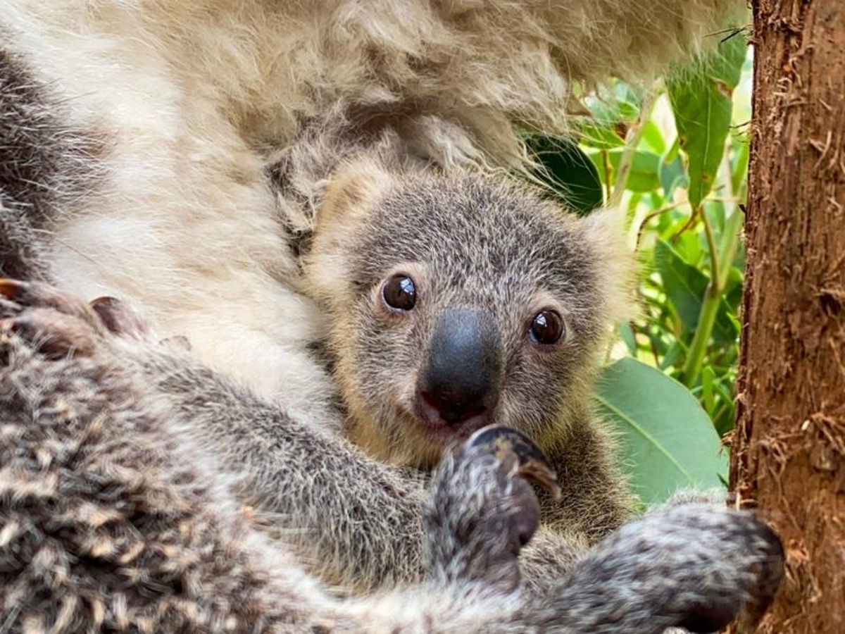 Newborn koalas stay in their mother's pouches for up to six months before emerging and attaching themselves to their mother's backs.