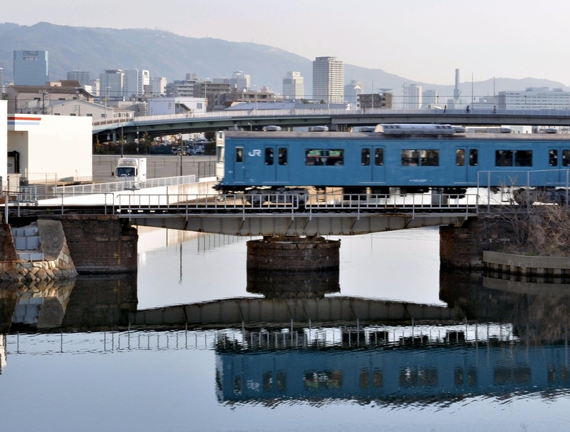 A sky blue 103 series train car pulled into Wadamisaki Station shortly past 7 a.m. The cars of this series were used for commuter trains on such lines as the Osaka Kanjo Line and the Yamanote Line of Tokyo when they were operated in the 1960s by the now-defunct Japanese National Railways. The cars of this series currently run on only a few lines, including the JR Kakogawa Line and Nara Line.