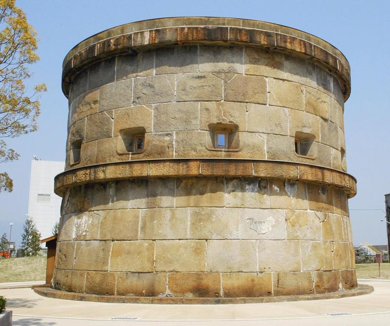 The remains of a battery are still existent on the premises of the Mitsubishi Heavy Industries' Kobe shipbuilding yard. The battery was built in 1864 in the late Edo Period (1603-1867) to protect the coast from foreign ships. Designed by Katsu Kaishu (1823-1899), the battery is cylindrical in shape and is about 15 meters in diameter and about 11 meters tall. Its exterior is made of stone and its two-story interior is made of wood.