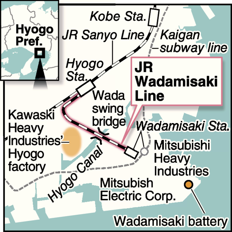 The Wadamisaki Line also serves another purpose. There is a site near Hyogo Station where the railway branches off into the Hyogo factory of Kawasaki Heavy Industries, Ltd.