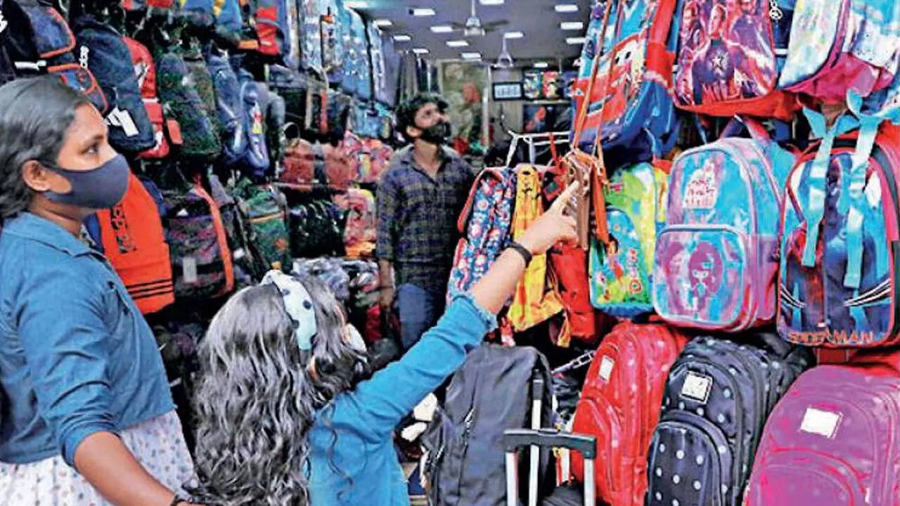 KOCHI: Broadway is buzzing with activity as people throng the city’s commercial hub for eleventh-hour shopping ahead of school reopening. Parents, accompanied by children, visit Broadway and shops in various parts of the district to purchase school bags, pencil boxes, water bottles, sandals and essential hygiene supplies to prevent Covid-19.