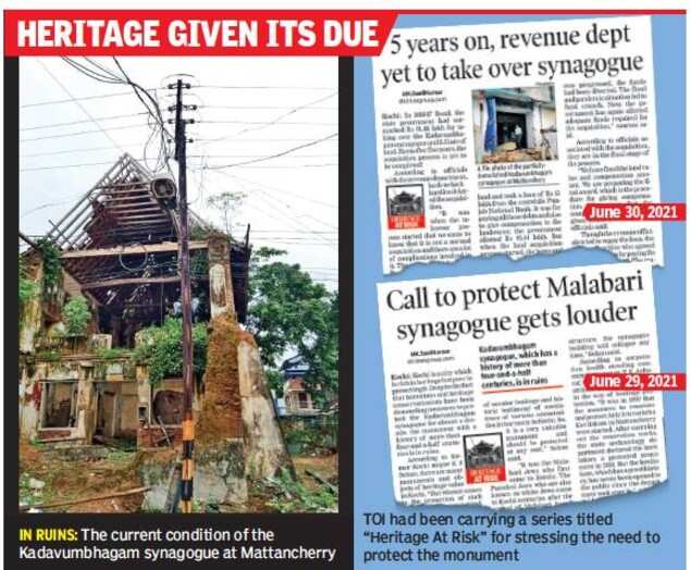 KOCHI: In what can be termed as a boost to heritage conservation efforts in the city, revenue department finally took over the over 600-year-old Kadavumbhagam Synagogue in Mattancherry and handed it over to archaeology department on Thursday.