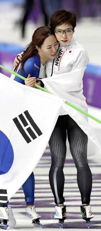However, their rivalry was set aside after the race finished -- Kodaira and Lee hugged each other and did their victory runs together, placing their national flags over their shoulders.